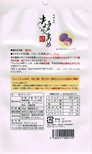 原材料:砂糖・水飴・植物油脂・ゼラチン・デキストリン・杏仁粉・脱脂粉乳・カムカム粉末・酸味料・ビタミンC・香料・着色料(紅麹)