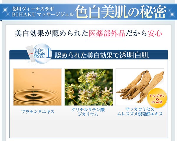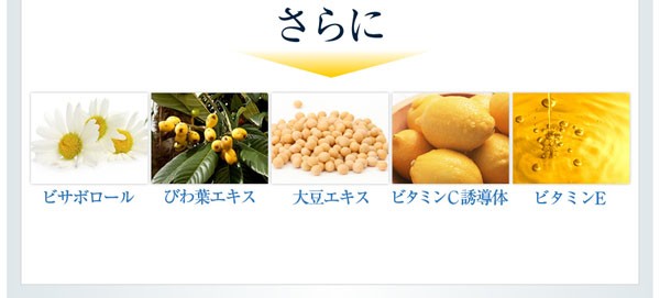 メラニンの生成を抑え、しみ、そばかすを防ぐ。 日やけ・雪やけ後のほてりを防ぐ。肌を整える。皮膚をすこやかに保つ。皮膚に うるおいを与える。