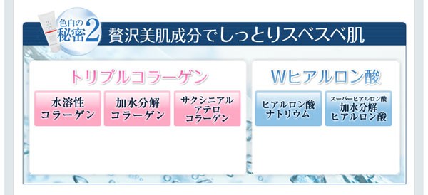 解コラーゲン液(4)、サクシニアルア テロコラーゲン液、加水分 解ヒアルロン酸、ビワ葉エキス、ダイズエキス、リン 酸L-アスコルビルマグネシウ