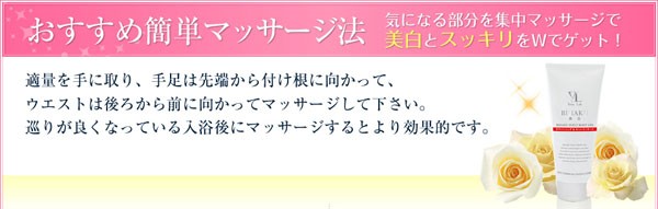適量を手に取り、気になる部分へ軽くマッサージするよ うに塗って下さい。入浴後に使用する際は軽く水気をとっ