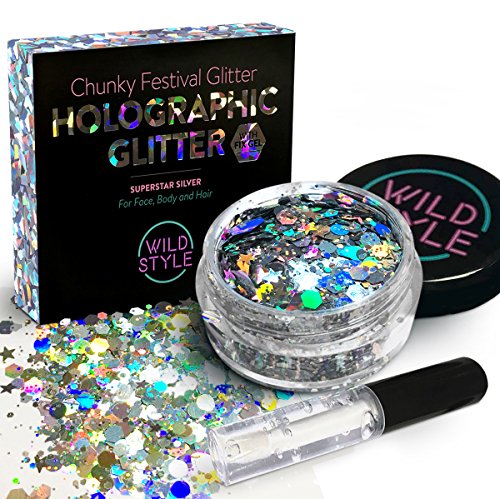 Cosmetic Glitter For Face, Body and Hair - Chunky Silver Holographic Glitter Mix - Versatile Festival, Rave and Beauty Makeup - Includes Long Lasting Fix Gel...