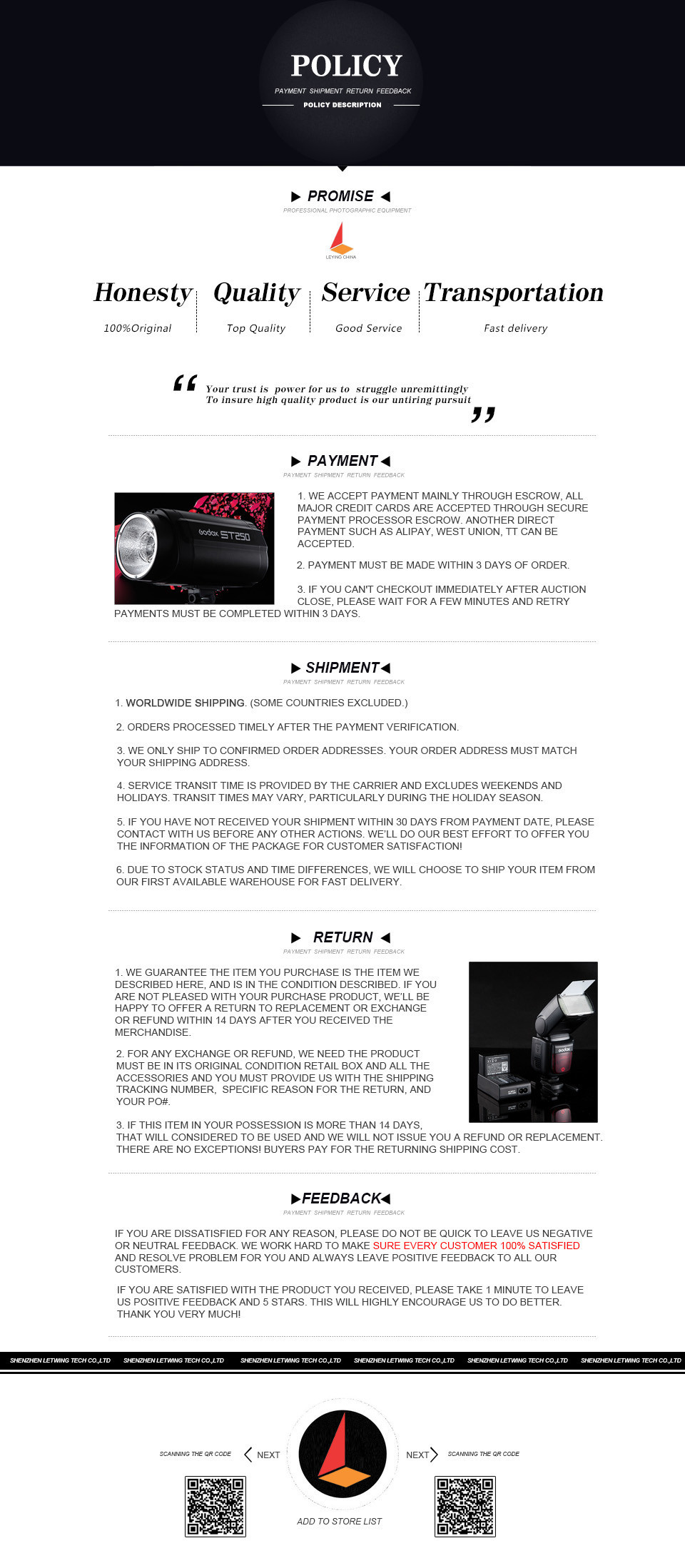 We maintain high standards of excellence and strive for 100% customer`s satisfaction.Positive Feedback is very important to us.Pls contact us before you leave Neutral or Negative feedback About Godox FTR-16 Wireless Control Flash Trigger Receiver for Godox AD180 AD360 Flash Speedlite or Studio Flash QT\QS\GT etc.We will try our best to resolve the problem,thanks.