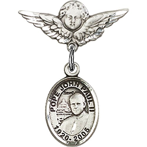 -. Title : Sterling Silver Baby Badge with St. John Paul II Charm and Angel w/Wings Badge Pin 7/8 X 3/4 inches