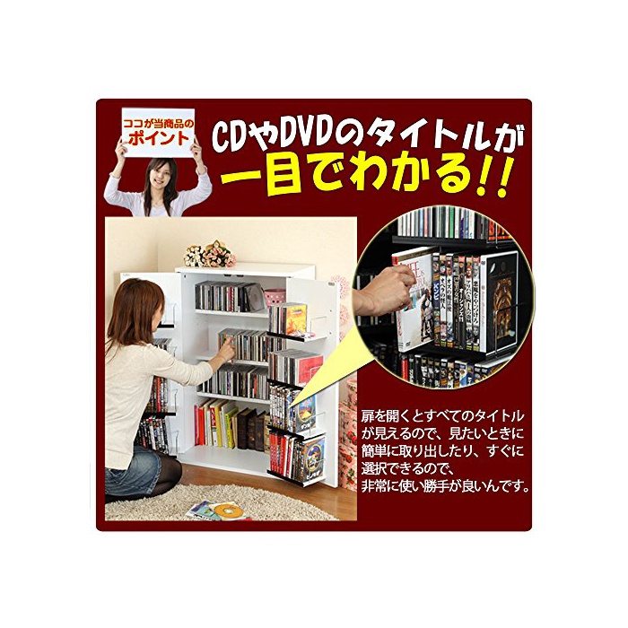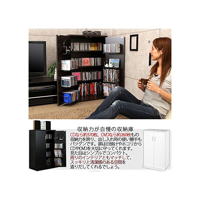 당상품은 수납력이 자랑의 수납고.CD라면 약370매,DVD라면 약260 매것 수납력을 뽐내고, 출납시의 쓰기에 편리 함도 발군입니다.문은 썬탠이나 먼지부터 CD나 DVD를 잘 지켜 주는 책임을 완수합니다.외형은 심플하고 콤팩트.주위의 인테리어와도(모두) 매치 하고, 깨끗이와 청결감이 있는 공간을 만들어 내어 줄 것입니다.