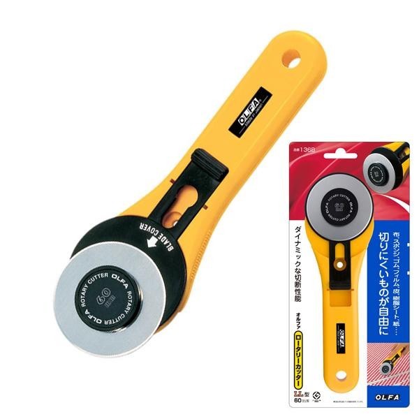 | 厚物や重ね切りに適した直径60ミリ円形刃を装着したロータリーカッターです。布や紙をはじめ、ゴムシート、フィルムなどの切りにくい素材も自在にカットできます。 |