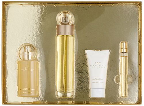 This classic fragrance is a sparkling floral with a crisp and clean sunny nature, a brightness all its own. As delightful as a breeze in a summer garden, Perry Ellis 360 for Women is a bouquet of floralcy and sensuality that captivates the senses. This brand new 4-piece gift set offers a unique assortment of fragrant bliss including a full-size spray, a travel purse spray, a hand cream, and a body mist.Feature