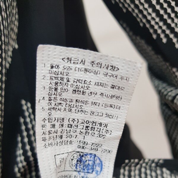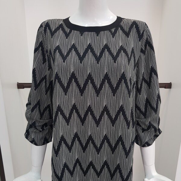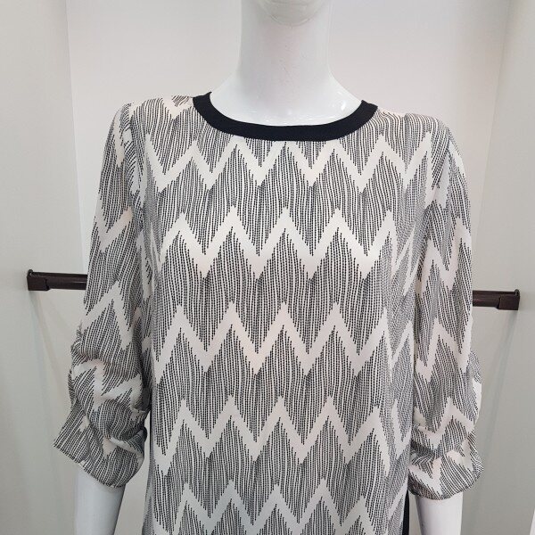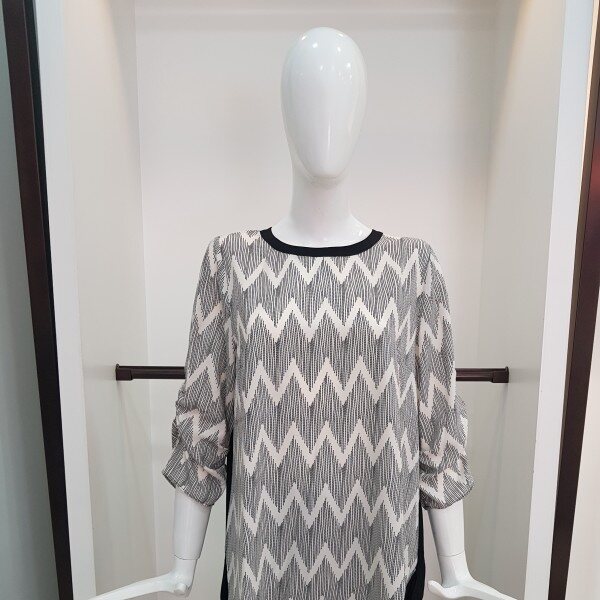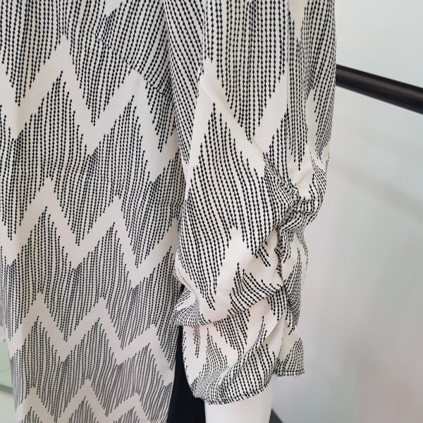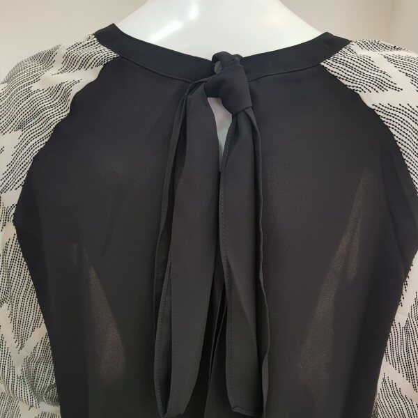프린트 소재의 셔링소매와 솔리드 배색 타이로 포인트를 준 블라우스