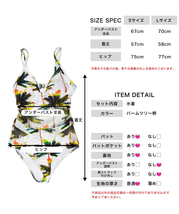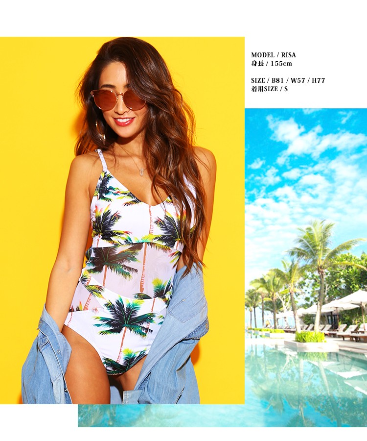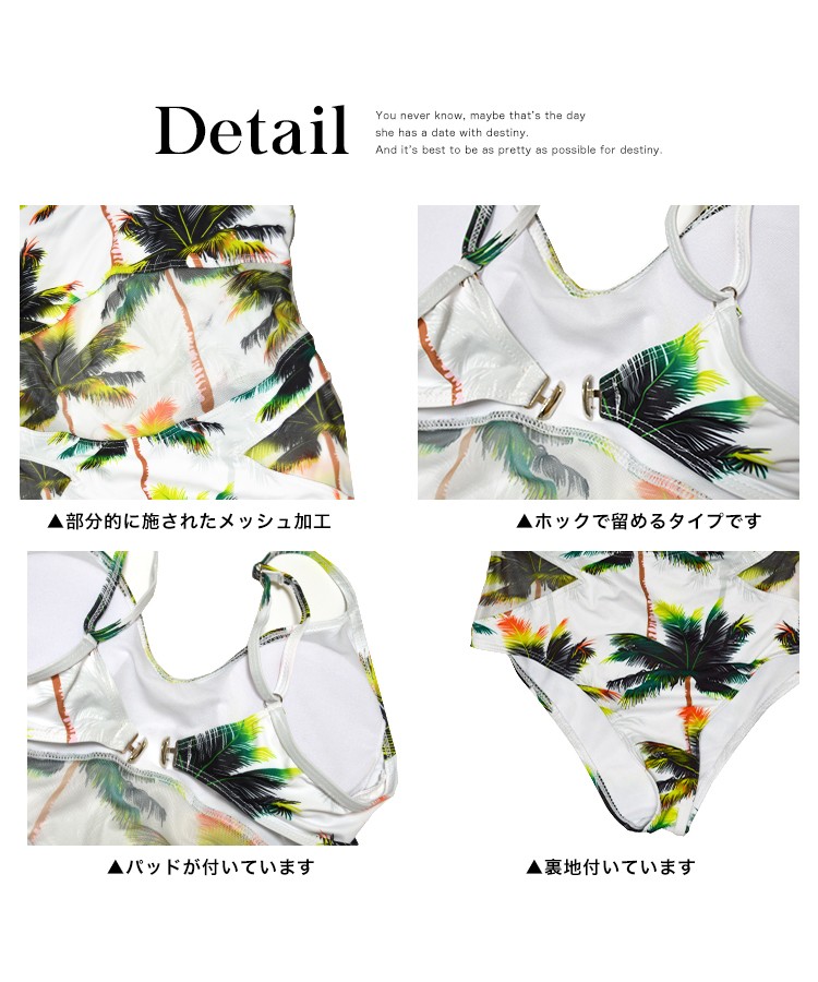 | 商品特徴 | LAVIA(ラヴィア)から新作のプチプラ水着が入荷しました。爽やかなホワイトカラーにリゾート感漂うビーチにマストなパームツリー柄。ウエストサイド、バックにかけて大胆にカッティングされており、ところどころほどよい透け感のメッシュ素材を使用した海外セレブ風な着こなしができるアイテムです。肩は紐、アンダーはフックタイプとなっているので着脱しやすいながらも安定感のある着心地!人気なワンピースビキニは体型カバー、スタイルアップ効果が期待できるので一つは持っておきたいアイテム。 |