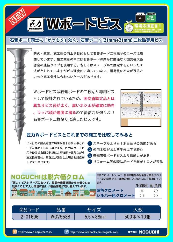 ●Wボードビスは石膏ボードの二枚貼り専用ビスとして設計されているため、国交省認定品とは異なりビス径が太く、高いネジ山が確実に効き、ラッパ頭が適度に潜るので締結力が強くより石膏ボード二枚貼りに適したビスです。