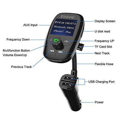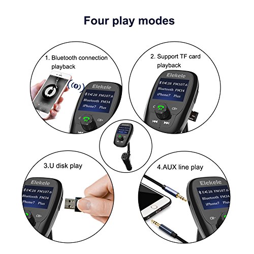 Description: ► Elekele FM Transmitter is a new Bluetooth FM Transmitter with Hands-free Car Kit Charger, which supports USB driver and TF card. It can automatically play and transmit the MP3 files of USB driver and TF card.