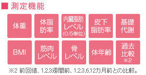 表示:体重/BMI/体脂肪率/皮下脂肪率/内臓脂肪レベル/基礎代謝/筋肉レベル/骨レベル/体組成年齢/過去比較