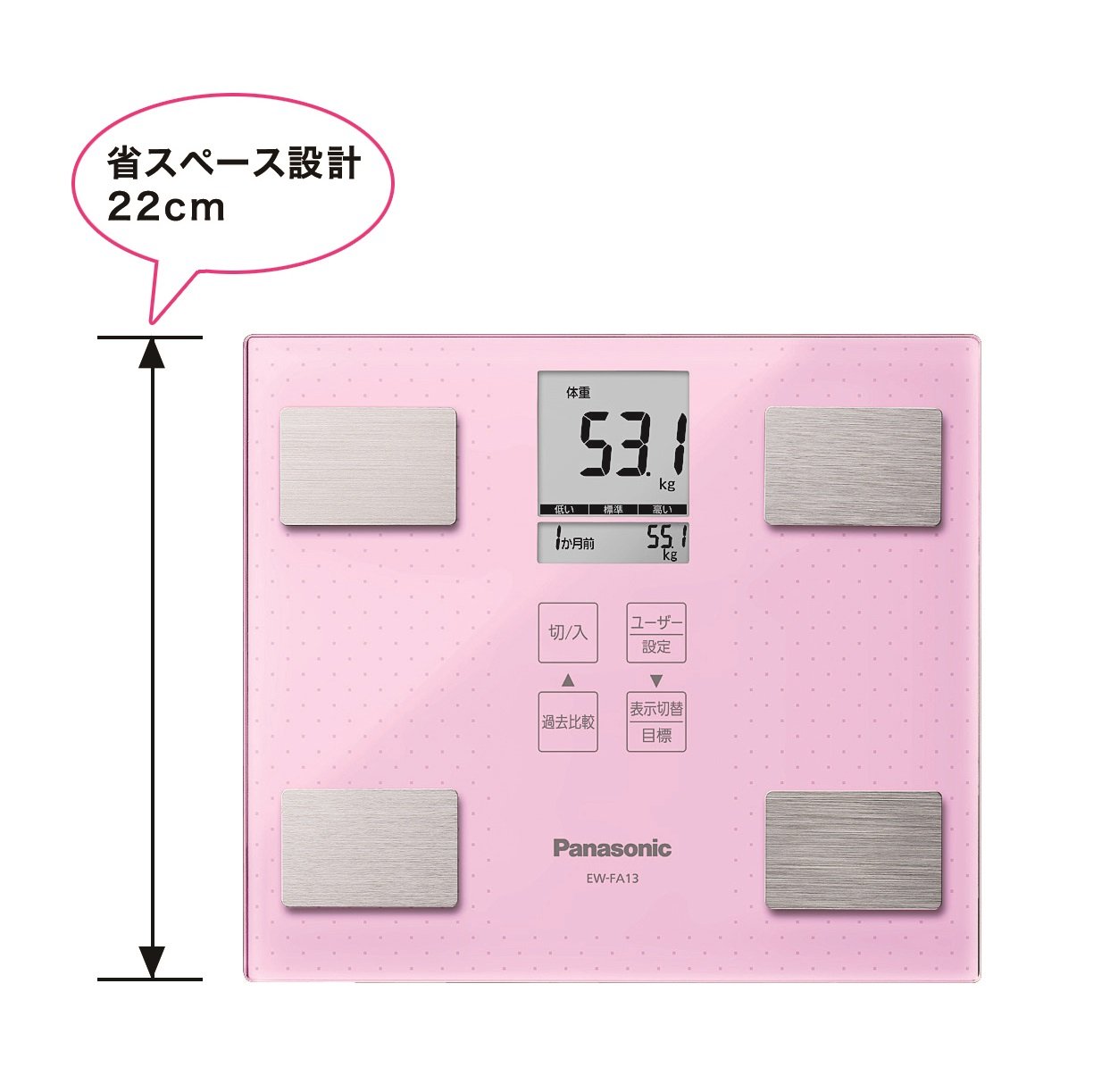 ◆乗ればユーザーを識別「のるだけID」乗るだけで電源が自動で入り、ユーザーを自動識別。体重や体脂肪率などをすばやく測定します。体型(体重、体脂肪率)の似たユーザーが乗った場合は交互に表示して選択。※事前にユーザー登録が必要です。登録は4人まで可能。◆減量目標を設定、カウントダウン表示1ヵ月の減量目標を入力でき、測定値から目標までの数値をカウントダウン表示。さらに前回から最長1年前までの記録との比較表示で変化を実感できます。 / ■ 仕 様 ■ カラー:ホワイト 測定可能重量:0~100kg(100g単位)、100kg~136kg(200g単位) BMI:0.1~136.0(0.1刻み) 体脂肪率:5.0~75.0% 内臓脂肪レベル:1~30(0.5単位) 皮下脂肪率:5.0~60.0% 基礎代謝:100~2999kcal/日 筋肉レベル:1~10(1単位) 骨レベル:1~10(1単位) 体組成年齢:18~80才 登録人数:最大4人 過去比較:過去(前回値、1、2、3週間前・1、2、3、6、12ヵ月前)との比較 電源:単4形アルカリ乾電池×4本 寸法(約):幅25×奥行22×高さ2.6cm 質量(約):1.16kg(乾電池除く) /