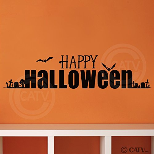 Happy Halloween with Graveyard vinyl lettering decal home decor wall art sticker bats (Medium 8x36)