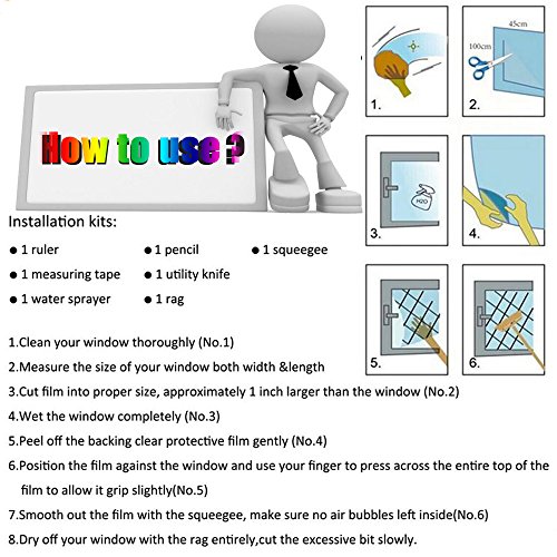 How to use: Step 1. clean the window or glass Step 2. spray the window or glass with soap water Step 3. peel off the glass film and put on the window or glass Step 4. squeegee away water and air bubbles,until they are flat and smooth.