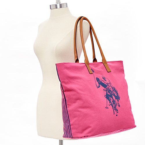 US Polo ASSN Women's Large Canvas Beach Tote Bag is uniquely designed bag, perfect for going out either for a Day for shopping or a night out on the town. It's stripes designed on the back and printed logos of the bag looks stylish and attractive. The interior of the bag features one zipper and two slip pockets, where you can securely store your personal items. Top zipper closure gives you a protection for your bag of falling your item.Feature