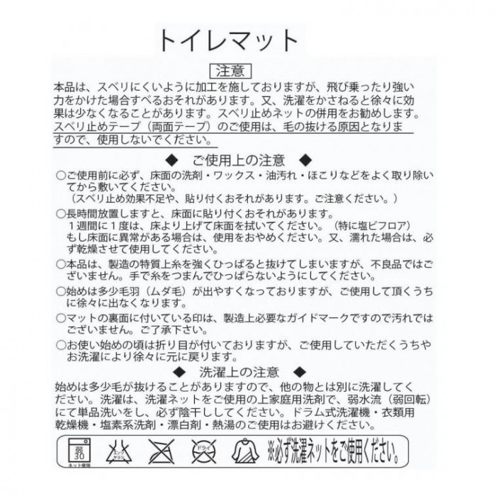 | 素材・材質 | トイレマット:アクリル100%(裏面:合成ゴム) フタカバー:アクリル100% |