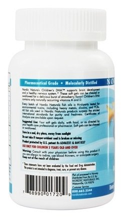 Nordic Naturals Children's DHA - 180 soft gels Kids everywhere love Nordic Naturals strawberry-flavored Children's DHATM. Made entirely from Arctic cod liver oil, these products are rich in the omega-3 DHA. DHA is essential for the proper development of the brain, eyes, and nervous and immune systems.* Easily swallowed or chewed by children over three, Children's DHA also contains healthy levels of 100% natural vitamins A and D.