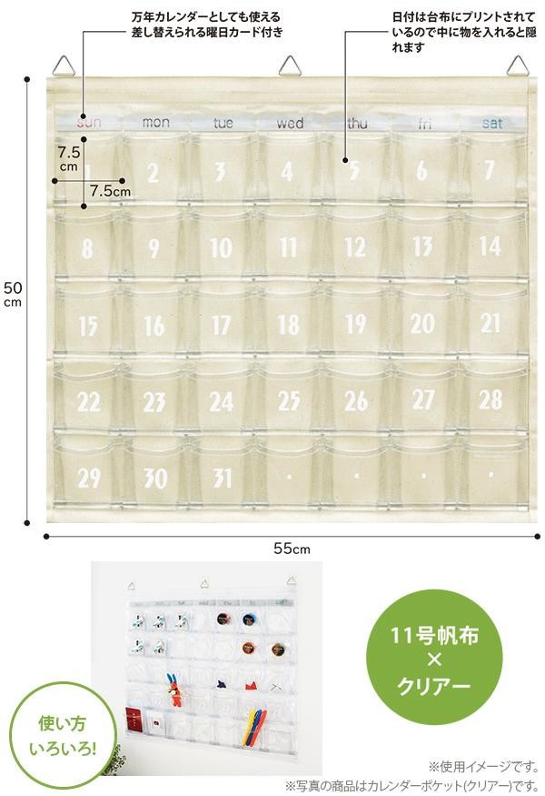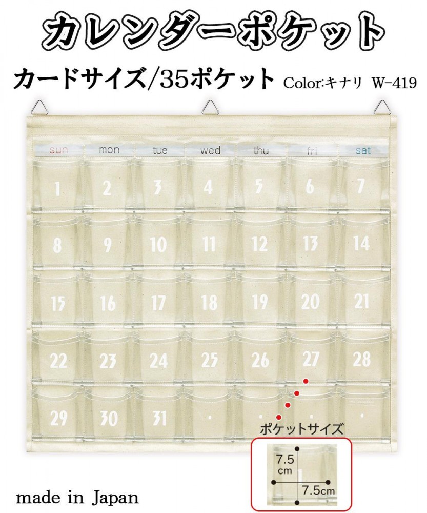 | カードサイズポケットが35個ついたカレンダーポケット日付は台布にプリントしているので 物を入れると日付が隠れます 付属の曜日カードを差し替えれば万年カレンダーとしても使えます 予定に合わせて 忘れがちなハンコやポイントカード 小物を収納するなど色々な用途にご使用いただけます |