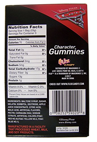 -. Binding : Grocery -. Brand : Disney Pixar Cars 3 Candy -. Feature : Disney Pixar Cars 3 Gummies- 3 Characters- Lightening McQueen, Cruz and Jackson Storm / Gummy Flavors- Strawberry, Blue Raspberry and Orange / Gummy- 1.26 Oz each Bag / This is perfect for any party favor Gift for Boys and Girls / Not recommended for children under 3 years -. IsAdultProduct : 0 -. Label : Flix Candy -. Manufacturer : Flix Candy -. PackageQuantity : 1 -. ProductGroup : Grocery -. ProductTypeName : GROCERY -. Publisher : Flix Candy -. Size : 12 Pack-36 Rings -. Studio : Flix Candy -. Title : Disney Pixar Cars 3 Lightning McQueen Cruz and Jackson Storm Gummies