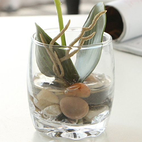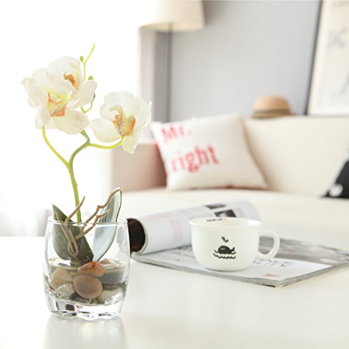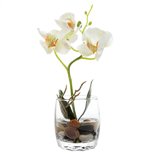 A beautiful artificial silk orchid in a crystal clear mini glass vase that makes a beautiful decorative accent for any space.