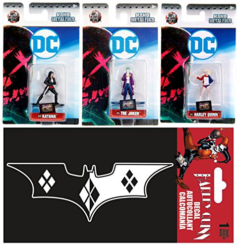 -. Feature : DC Comic Suicide Squad Villains Series pack Figures / Sticker Decal / Jada Toys -DC Nano Metalfigs -100% Die-Cast Metal Figure 3-Pack -1.5" / Harley Quinn with Bat (DC5) Suicide Squad Movie Edition / Katana (DC19) & The Joker (DC6) Mini figures / HARLEY QUINN CAR Window Decal Sticker ~ Batman Harley Quinn Symbol ~ 2"x6" One Color