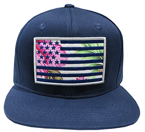 Title : Great Cities Hawaiian Floral Print USA FLAG Flat Bill Snapback Cap Hat (Navy Blue)