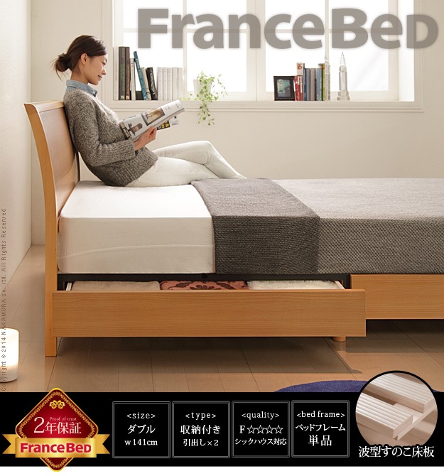 【床板部分がすのこ仕様のベッドです】床板部分がすのこなので通気性が抜群です。脚付なのでお掃除に便利。お掃除ロボットも使用できます。薄型引出しは左右どちらにも取り付けられます。引出しはスライドレール付き。