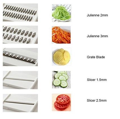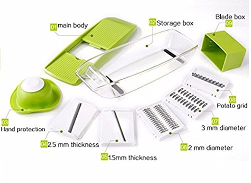 5 IN 1 VEGETABLE SLICER: Mandoline Slicer contains 5 built in ultra sharp blades and a large food storage box which also can be used as storage for the blade. Set of blades include 1 thin and 1 thick cucumber and potato slicer; 1 thin and 1 thick veggies Julienne slicer grater and 1 potato chips grater.