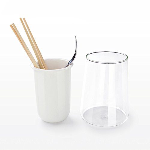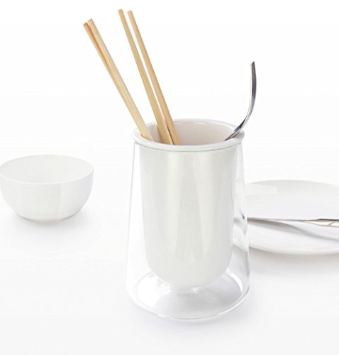 - Made of ceramic and transparent glass. The minimalist design looks modern yet timeless on any kitchen countertop or household setup.