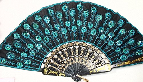 doopootoo Peacock Pattern Sequin Fabric Hand Fan Decorative Fashionable (New Blue)
