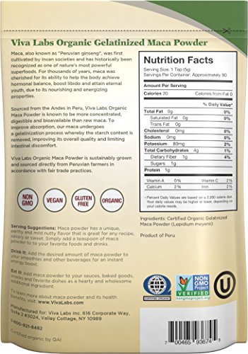 - Title : Viva Labs #1 Organic Maca Powder, Gelatinized for Enhanced Bioavailability, Non-GMO, 8 oz Bag