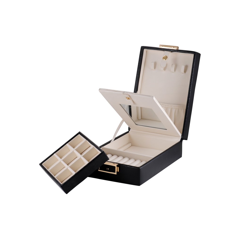 ジュエリーボックスのサイズ:6cm (H) X 12cm (W) X 17cm (L) 多層構造のダブルスリットデザインで、さまざまなジュエリーを収納可能 指輪、ペンダント、チェーン、イヤリング等が入ります。中に鏡があり外側から鍵がかかります。 二段式でたくさんジェエリーが入ります! 3×3、合計9つの仕切りでイヤリングや指輪等小さなジェエリーの保管にぴったりです。 ジェエリーを安全に区分けして持ち運べます。お気に入りのジェエリーが旅行先でも楽しめます!