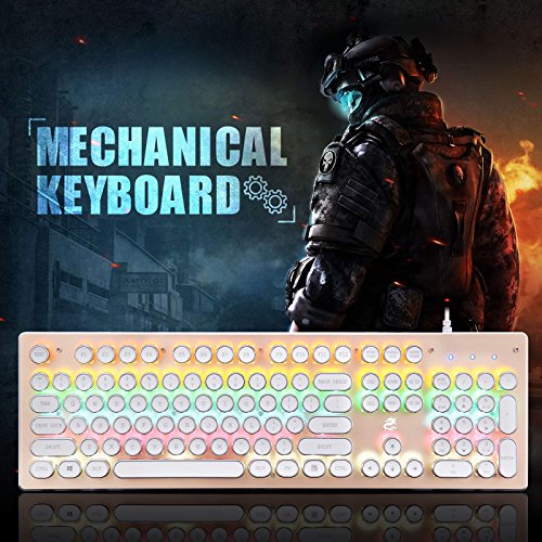 -. Feature : RGB-backlit anti-ghosting mechanical gaming keyboard for a more immersive, colorful typing and gaming experience. / Standard 104 keys. Brilliant colorful RGB LED backlit with various modes. Built-in high performance 64K Flash SCM. / High-grade materials, steampunk Vintage typewriter. Round, black typewriter-style keycaps bring you a nostalgic feeling with their eye-catching retro aesthetic. / This gaming keyboard has the satisfying "clicky" sound, blue switches are fastly responsive for gamers or typists. / Brings you an ambilight visual feast; Unique and excellent keystroke feeling, crisp and melodious beat rhythm will offer you an extraordinary operating experience for both typing and gaming!