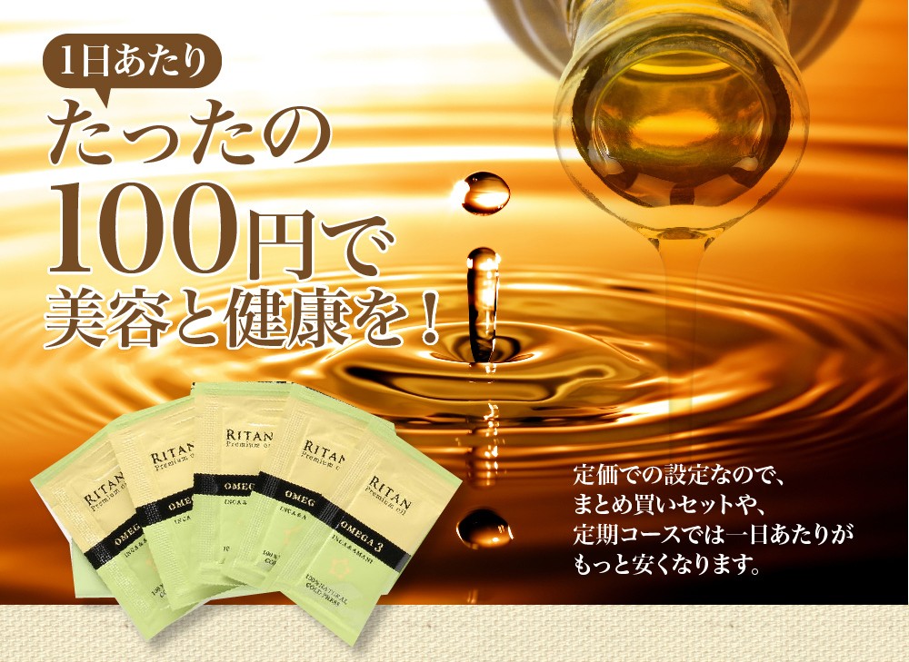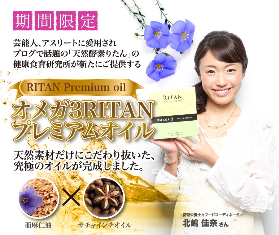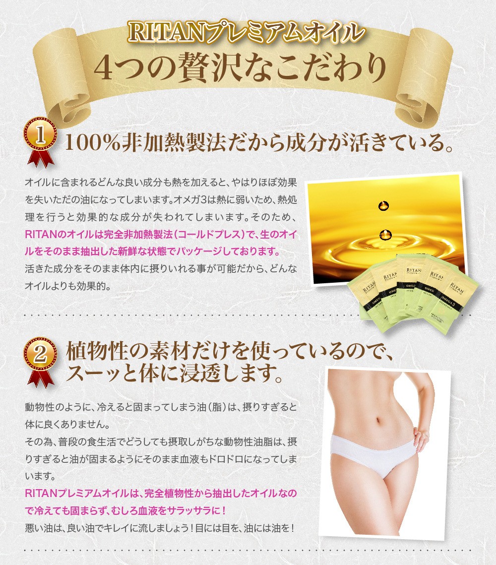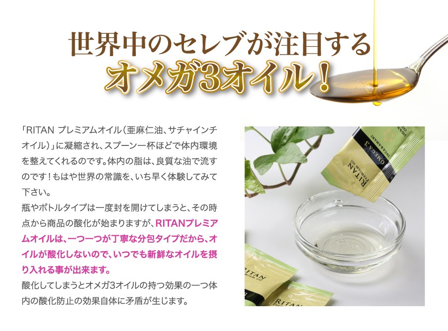 【商品名】RITANプレミアムオイル 植物油含有加工食品【内容量】60g(2g×30包)1日2gで約一ヶ月分※1箱【栄養成分】1包(2g)あたりエネルギー18kcal たんぱく質0g 脂質2g 炭水化物0g ナトリウム0mg トランス脂肪酸0g【製造国】日本【保存方法】直射日光、高温多湿な場所を避けて涼しい所で保管してください。【お召し上がり方】1日1包を目安にそのままお召し上がりになるか、サラダや納豆、調理後のパスタや野菜炒めなどにかけてお召し上がりください。【お取り扱い上の注意】体質、体調に合わない場合はご使用を中止してください。通院、投薬中、妊娠中、授乳中の方は医師にご相談の上、ご使用ください。開封後はお早目にお召し上がりください。(送料無料 サプリ 国産 日本製 オメガ3 サプリメント ダイエット 液体 生酵素 無添加 酵母 美肌 美容 健康 人気 美味しい セレブ おすすめ ランキング ダイエット食品)