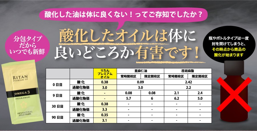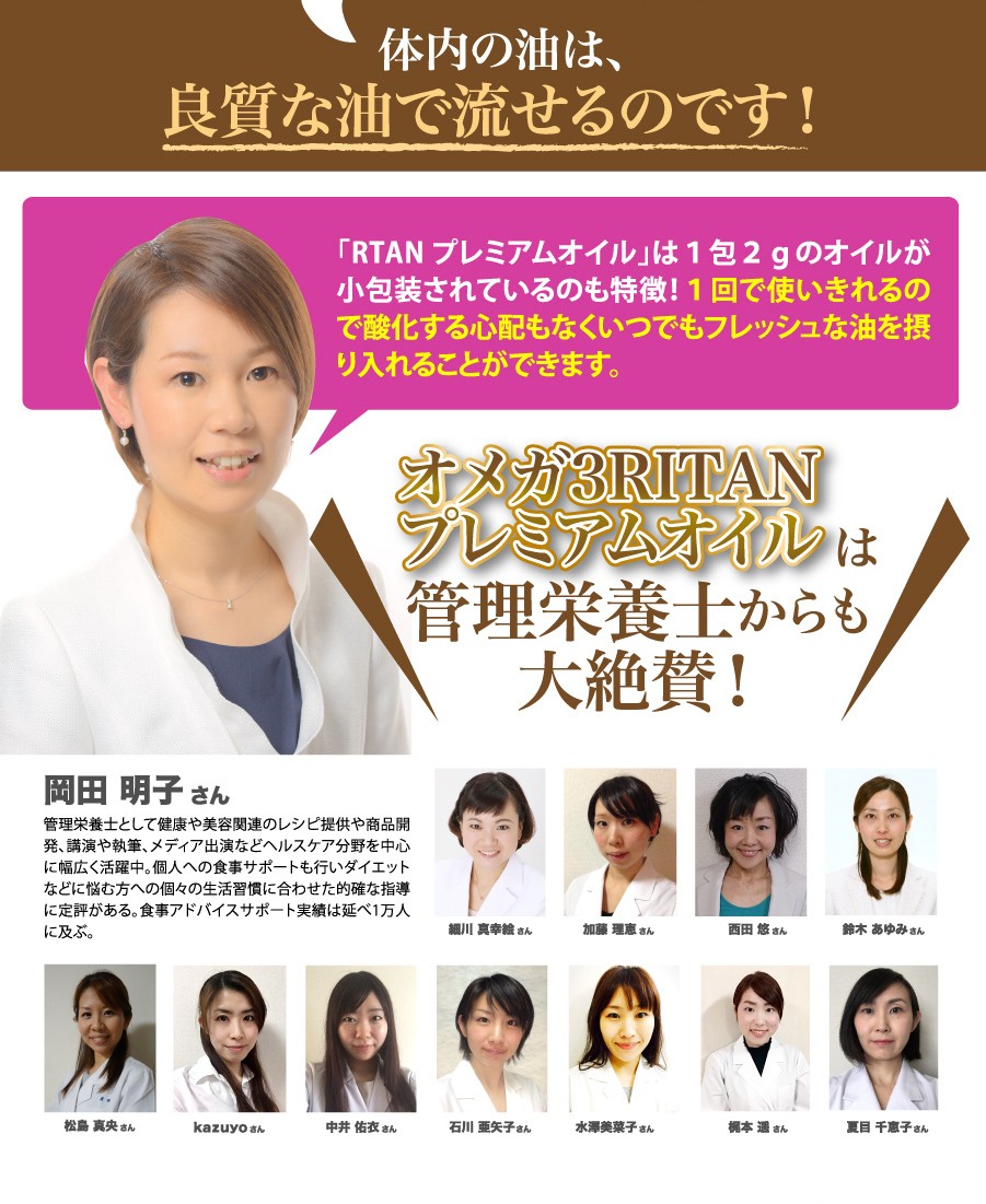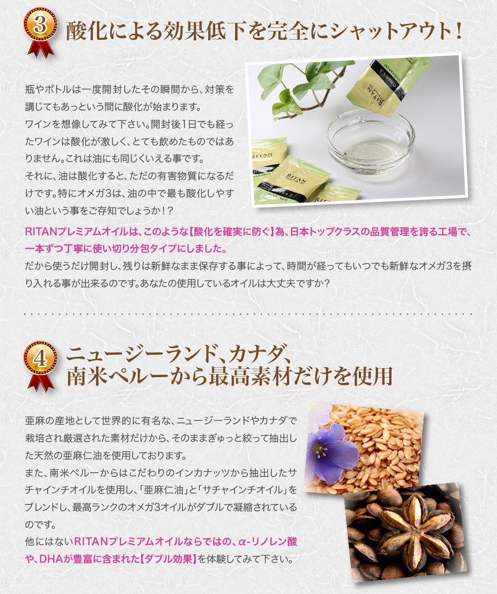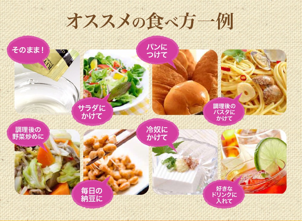 【商品名】RITANプレミアムオイル 植物油含有加工食品【内容量】60g(2g×30包)1日2gで約一ヶ月分※1箱【栄養成分】1包(2g)あたりエネルギー18kcal たんぱく質0g 脂質2g 炭水化物0g ナトリウム0mg トランス脂肪酸0g【製造国】日本【保存方法】直射日光、高温多湿な場所を避けて涼しい所で保管してください。【お召し上がり方】1日1包を目安にそのままお召し上がりになるか、サラダや納豆、調理後のパスタや野菜炒めなどにかけてお召し上がりください。【お取り扱い上の注意】体質、体調に合わない場合はご使用を中止してください。通院、投薬中、妊娠中、授乳中の方は医師にご相談の上、ご使用ください。開封後はお早目にお召し上がりください。(送料無料 サプリ 国産 日本製 オメガ3 サプリメント ダイエット 液体 生酵素 無添加 酵母 美肌 美容 健康 人気 美味しい セレブ おすすめ ランキング ダイエット食品)