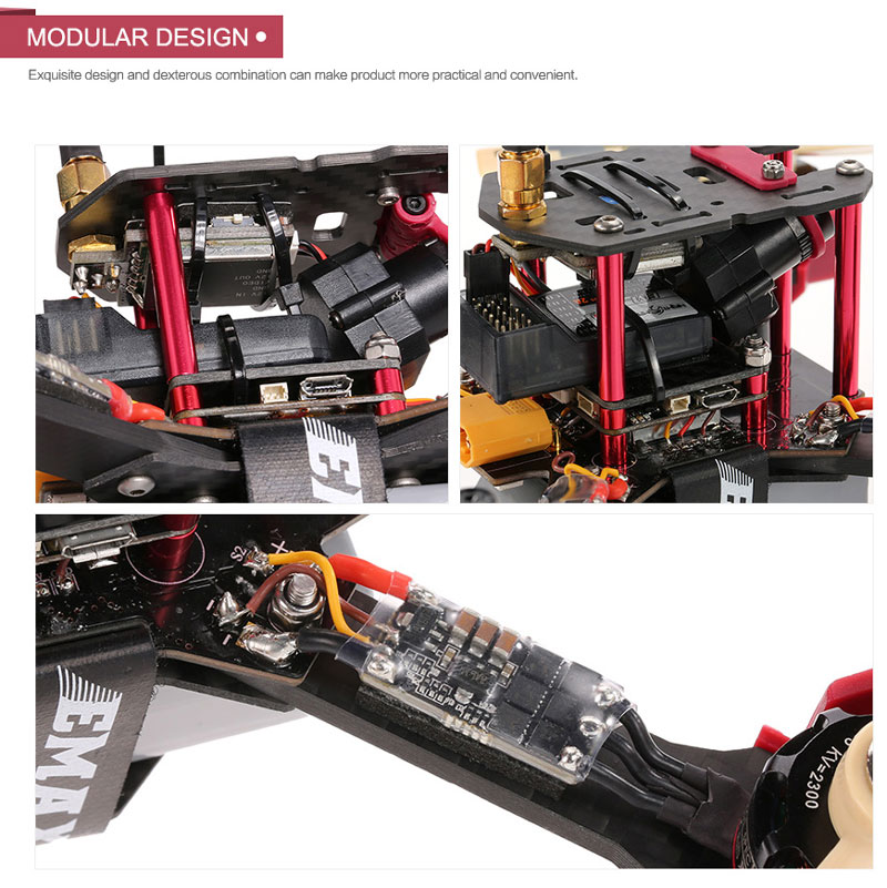 The center of gravity and low resistance airfoil design make the fly faster and more agile and let the racing drone be more suitable for competition.