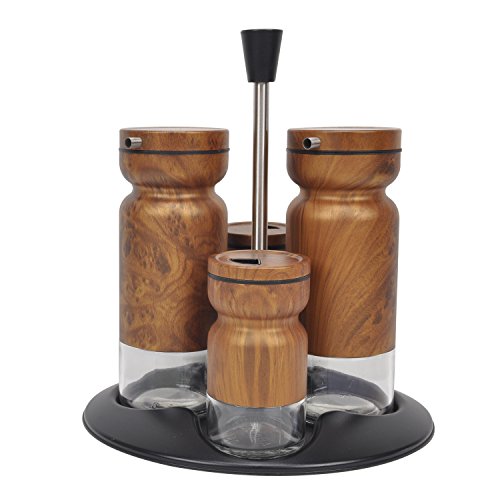 -. Feature : Made of High Quality Materials for Durability and Safe Use. Stainless Steel Cover Glass Body Prevents Shattering. / Clear Glass Bottom Acts as an Refill Indicator and Quick Content Identification. Aerated Pouring Nozzle Reduce Drips and Three Options of Hole Selection for Shakers. / Intend for Oil, Vinegar, Salt and Pepper, though it's Ideal for Sugar, Spice, Herb, and Soy Sauce as well. / 4 Pieces Dining Cruet Set Included 2 Dispensers, and 2 Shakers, Complete with a Custom Carry Tray that Keeps Neatly Organized and Effortless Transfer Portability. / Available in Many Variation of Faux Print, Included Polish, Bronze, Bamboo, and Wood Grain.