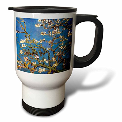 3dRose Almond Blossoms By Vincent Van Gogh 1890 Famous Fine Art By Masters White Flower Branches on Blue Travel Mug, 14 oz, Stainless Steel, White