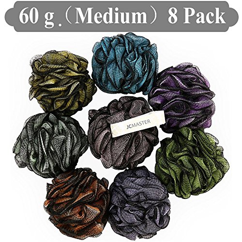 8 bath sponges come in a pack, large and puffy, each 60g. Green, orange, purple, yellow, cyan, blue, purple and red with a layer of black mesh covered