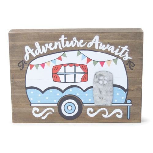 - A hand painted vintage camper in the center with a message above the camper that says "Adventure awaits"
