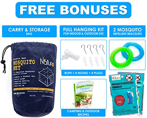 ✔ HANGING KIT + STORAGE BAG + E-BOOK & 100% SATISFACTION GUARANTEE: We here at NATURO have the customers’ best interest at heart! That is why, we offer you the ultimate set that includes the mosquito net, 2 mosquito repellent bracelets, a full hanging kit (includes wall mounts and rope) and all these nice and tidy in a fine carrying bag. Last but not least you will get an E-book “Camping & Outdoor Recipes” and our 100% satisfaction guarantee!