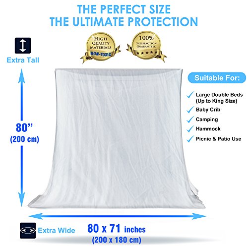 ✔ EXTRA LARGE NET FOR EXTRA SAFETY: Our mosquito net bed canopy is cleverly crafted so as to bear the tiniest holes (225 holes/2 inches) that will prevent mosquitoes and other annoying insects from entering while you are enjoying your nap! Let the refreshing cool breeze reach you and make this nap the best you have ever had! Plus, it is the largest mosquito net in the market (80''x 80''x 71''). Suitable for any type of bed: a king size bed, toddlers bed or as mosquito net for crib !It's Perfect