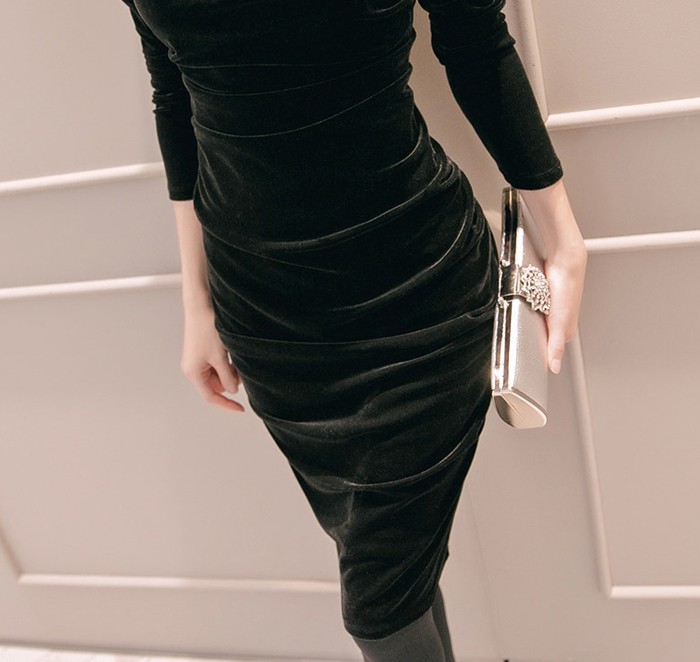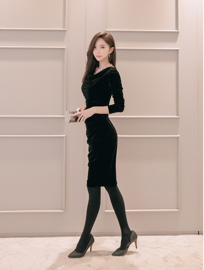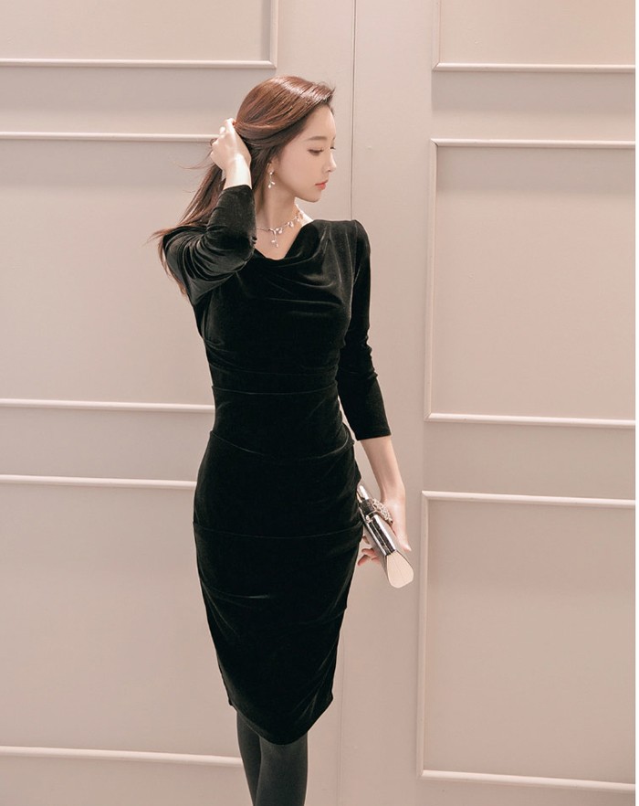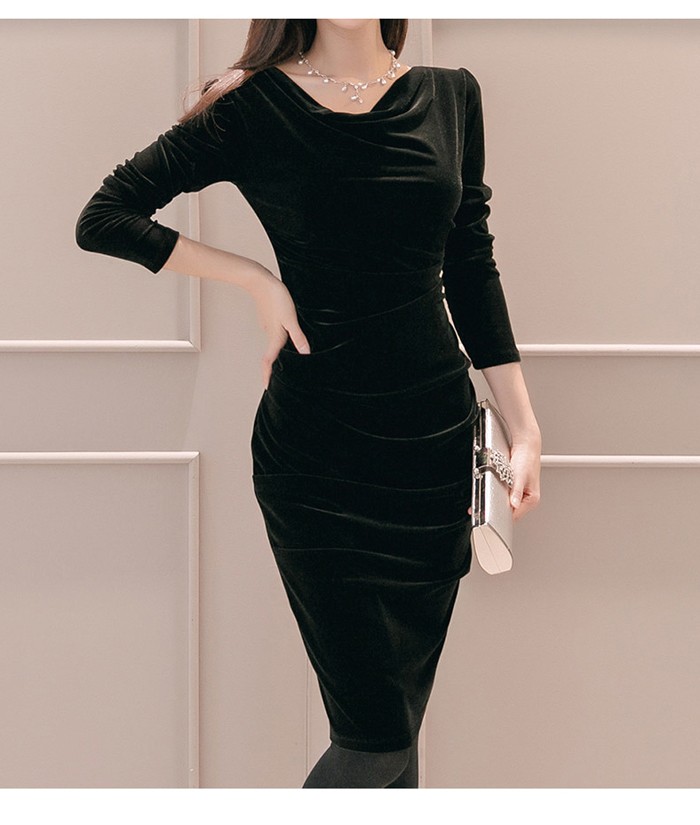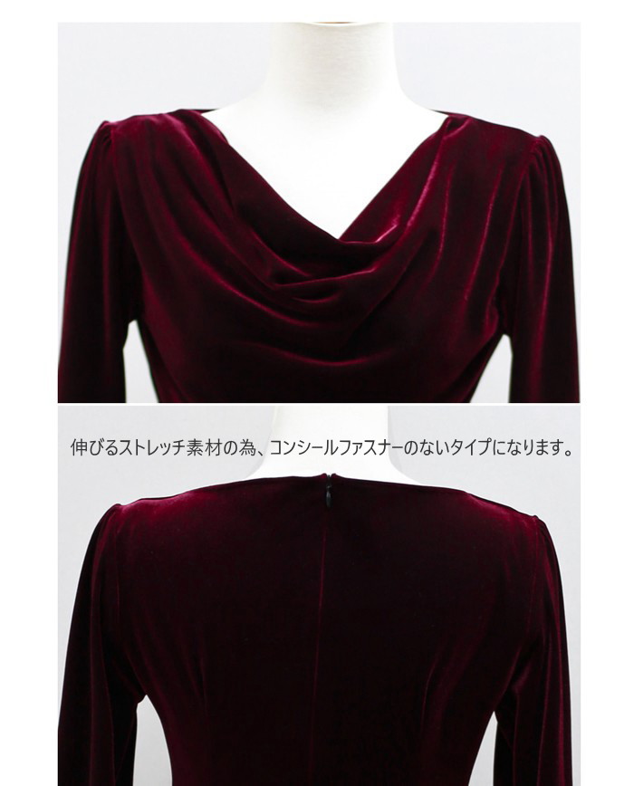 商品名:ワンピース 無地 ベルベット 長袖 膝丈 きれいめ