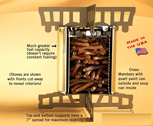 Should be in everyone's emergency survival gear, bug-out bag or camping kit. With 7" spread Stove Cross-Members (with full surface support) can easily convert food cans of a wide range of sizes into a steady, powerful, efficient, lightweight, portable and smart stove.