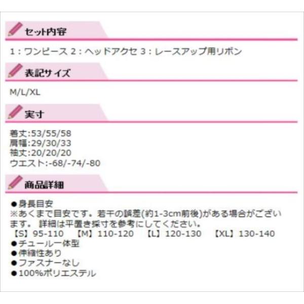 ☆☆☆☆☆☆☆☆☆☆☆☆☆こちらの商品は3営業日以内に発送します☆☆☆☆☆☆☆☆☆☆☆☆☆☆------------------------お店にハロウィングッズが並んできましたね!今のうちからそろえておきましょう。今回は在庫のある商品をそろえました。中国からの商品は10月に休日があるので取寄は納期が遅れてしまいます。だからこそ、今回は即納でご用意しました!☆------------------------【セット内容】1:ワンピース 2:ヘッドアクセ 3:レースアップ用リボン【カラー】画像の色【サイズ】M(品切れ)着丈:53cm肩幅:29cm袖丈:20cmウエスト:68cmL着丈:55cm肩幅:30cm袖丈:20cmウエスト:74cmXL着丈:58cm肩幅:33cm袖丈:20cmウエスト:80cm※1-2cmの誤差あり★海外生産の為、多少の柄ずれ、キズ、汚れがある場合があります。★画面上と実物では多少色合いが異なって見える場合もございます。