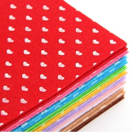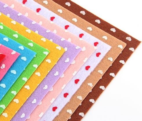 Polyester felt fabric sqauares with a heart print felt heart design. 6 x 6 squares in a mix of colors -10 pieces