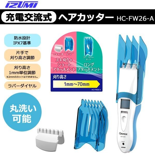 | 仕様 | カラー:ブルー 電源:充電交流式(AC100-240V・50/60Hz) 消費電力:6W コード長:1.8m 充電時間:8時間 使用可能時間:40分 刃種類:鋭角刃でクリーンカット 本体水洗い可 防水設計:IPX7基準 【刈高さ(1mm単位調節)】 ショートアタッチメント:1~36mm ロングアタッチメント:37~70mm |