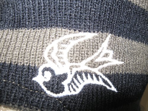 This is an adorable knit trapper hat with ear covers. This black and gray striped hat features pom pom ties and top tassels. There is a cute white sparrow embroidery on the front side. The hat is made out of 100% acrylic materials and is SUPER stretchy, making it fit most head sizes. This is a super cute way to keep your head and ears warm on a cold fall or spring day! MSRP: $16.99 0