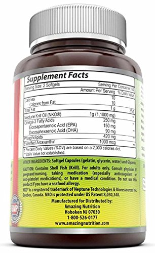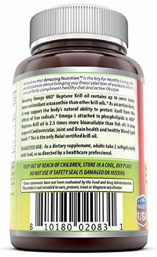 Studio : Amazing Nutrition Publisher : Amazing Nutrition Binding : Health and Beauty Product Description * Amazing Omega NKO® Neptune Krill is sustainably harvested under stricter regulatory standards from the oceans of Antarctica. Amazing Omega NKO® Neptune Krill oil is clinically tested and scientifically validated to contains up to seven times more antioxidant astaxanthin than other krill oils. * As an antioxidant, it may support the body's natural ability to protect itself from the effects of free radicals. Amazing Omega Neptune Krill Oil Softgels are an ideal supplement for omega-3s, which supports Cardiovascular, Joint and Brain health and healthy Blood Lipid levels. This is the only Halal certified krill oil. * Krill Oil is a great alternative to fish oil, the Omega-3 attached to phospholipids in NKO® Neptune Krill oil is 2.5 times more bioavailable than fish oil. Krill oil has no fishy aftetaste and is easier to digest and absorb. Plus it contains extra antioxidants. * All Amazing Nutrition products are manufactured in accordance with Good Manufacturing Practices (GMP), among the highest standards in the world. * All our products are proudly made in USA with Guaranteed Purity Potency. We offer best quality products for the best value. All our products are Third Party Tested. We do not compromise on quality, our products are free of Artificial ingredients, Stearates, Sulphates, Dioxides and Laurates.