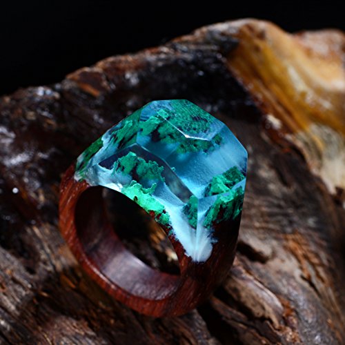 FANTASY WORLDS AND LANDSCAPES: Glow in Dark Ring, The unique resin wood ring is made of light blue resin with majestic waterfalls that glow in the dark and vegetation.